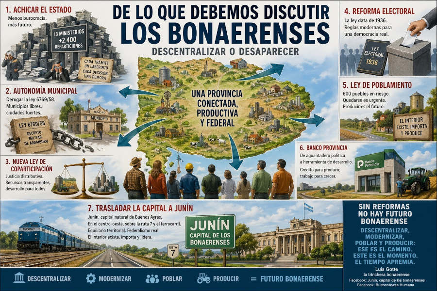 Sin estas reformas, no hay futuro bonaerense. La provincia se desangra en su propia inercia. Descentralizar, modernizar, poblar y producir: ese es el camino. Este es el momento. El tiempo apremia.