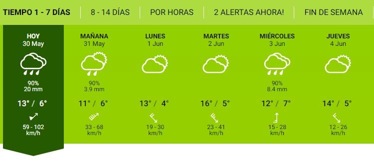 Para mañana domingo se esperan lluvias débiles por la mañana, mejorando lentamente con cielos mayormente cubiertos. El viento regular del Suroeste no permitirá que la temperatura trepe mas alla de los 10°C, por lo que la temperatura se mantendrá baja.