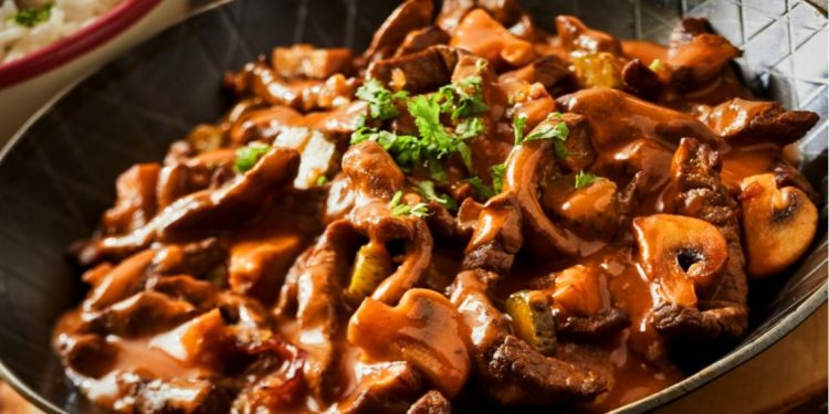 El Lomo Strogonoff, es un plato de carne de ternera cortada en dados y acompañado con hongos, cebollas y salsa hecha de crema agria, servido sobre arroz o pasta. La composición del mismo hace que pueda producirse en grandes cantidades.